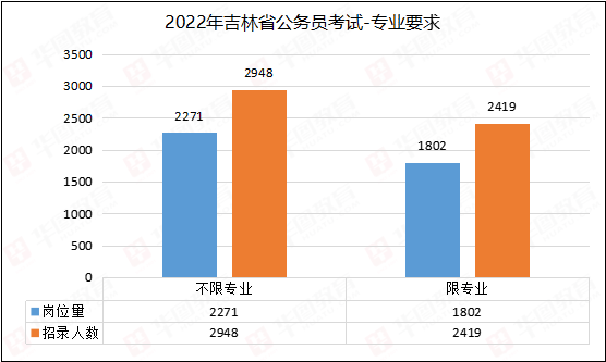 根据吉林华图的统计,今年招录岗位中,不限制专业的岗位为2271个,共2948人,占总人数54.9%,与去年的52.1%相比,略有提升。2022年限制专业人数可达2419人,占总人数45.1%,与去年基本持平,这说明,对专业人才的需求依然稳定。而一些专业依然为香饽饽,比如法学、财会、审计、计算机等。