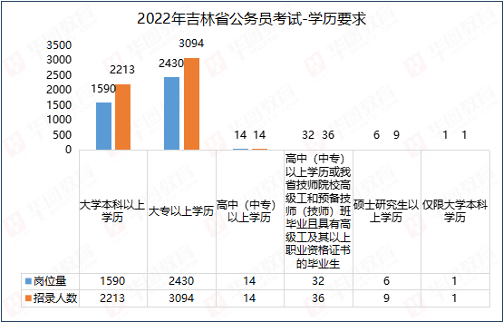 根据吉林华图的统计,在招录岗位中,要求本科招录人数为2214人,占总招录人数41.3%;大专招录人数为3094人,占总招录人数57.6%。两者占比与去年相比基本持平。值得注意的是,从2022年开始,学历要求中不再对“统招”有所限制。