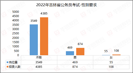 根据吉林华图的统计,2022年公务员招录岗位中,不限性别的岗位有3549个,招录人数4385人,占总人数的81.7%,有469个岗位明确要求仅限男性,招录人数占总人数的16.3%,而仅限女性为占2%,可见,公务员招录对男性考生更为友好。