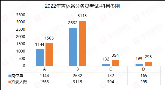 根据吉林华图的统计,今年招录岗位中科目类别为A(申论甲)的岗位有1144个,招录人数1563,占总人数29.1%;科目类别为B(申论乙)的岗位有2632个,招录人数3115,占总人数的58%;科目类别为C和D(申论丙)的岗位有297个,招录人数689,占总人数的12.8%。