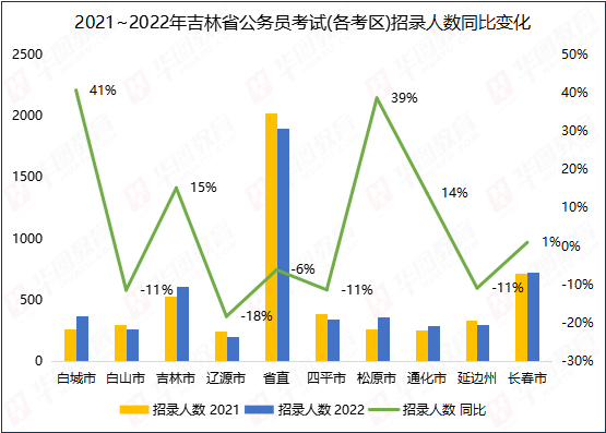 根据吉林华图的统计,今年整体招录人数变化不大,白城市、松原市岗位的招录大幅增加,增幅达到41%和39%,除此之外吉林市、通化市招录人数也有增加。与2021年相比,降幅较大的城市是辽源,降幅为18%。