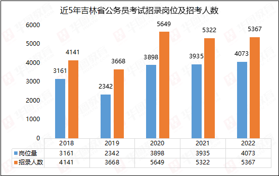 根据华图教育的统计,吉林公务员考试招录人数连续三年突破5000人大关。2022年招录人数与去年相比增加45人,同比上升0.85%,人数波动较小。但考虑到这两年的疫情压力,竞争压力恐会增大。